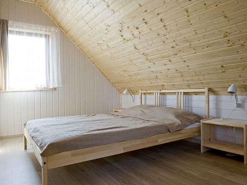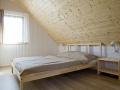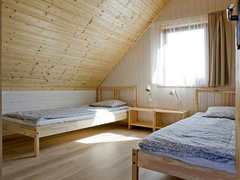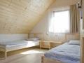 • W domku, na piętrze znajdują się dwie sypialnie, jedna z szerokim dwuosobowym łóżkiem i druga z dwoma jednoosobowymi.