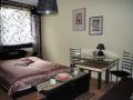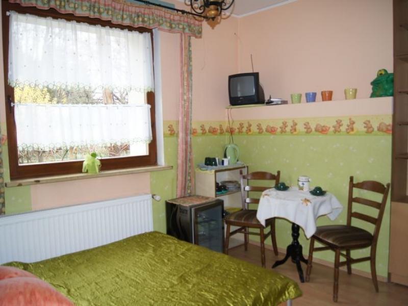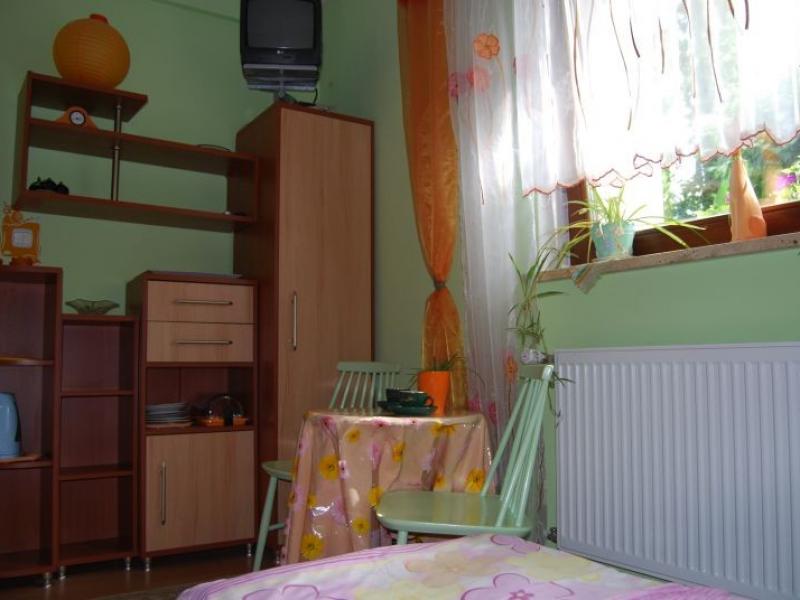 Pokój mieści się na parterze ok 4 metry od wejścia głównego do budynki. Wyjście z budynku jest na ogród, gdzie można sobie odpocząć w otoczeniu zieleni. Pokój posiada : czajnik, TV-SAT, talerze, kubki, filiżanki itp
