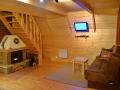 Na parterze znajduje się jadalnia i aneks kuchenny z pełnym wyposażeniem dla 8 osób, lodówka, kuchenka elektr. i mikrofalowa, ; łazienka z WC, umywalką, kabiną natryskową z brodzikiem; salon z dwiema podwójnymi rozkładanymi kanapami, TV z DVD+ CD (należy zabrać własne płyty). W centrum kominek tworzący niepowtarzalną atmosferę. Na poddaszu znajdują się dwa przytulne pokoiki (jeden z balkonem) z dwoma pojedyńczymi łóżkami, które można zsunać w jedno dwuosobowe. Zapewniamy pościel, ręczniki we własnym zakresie.